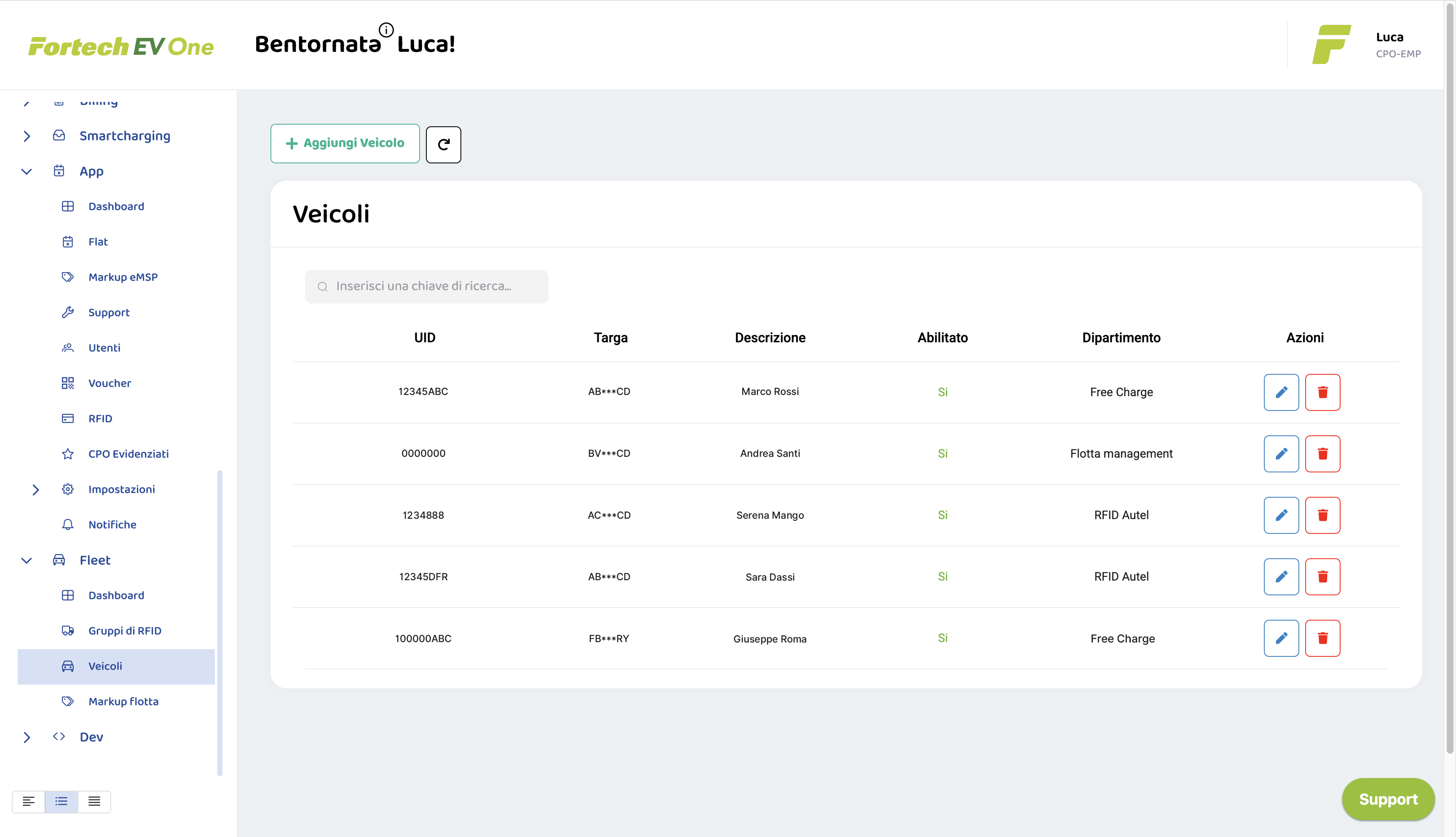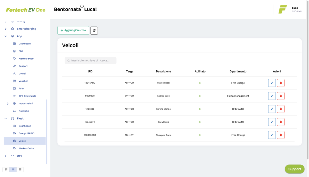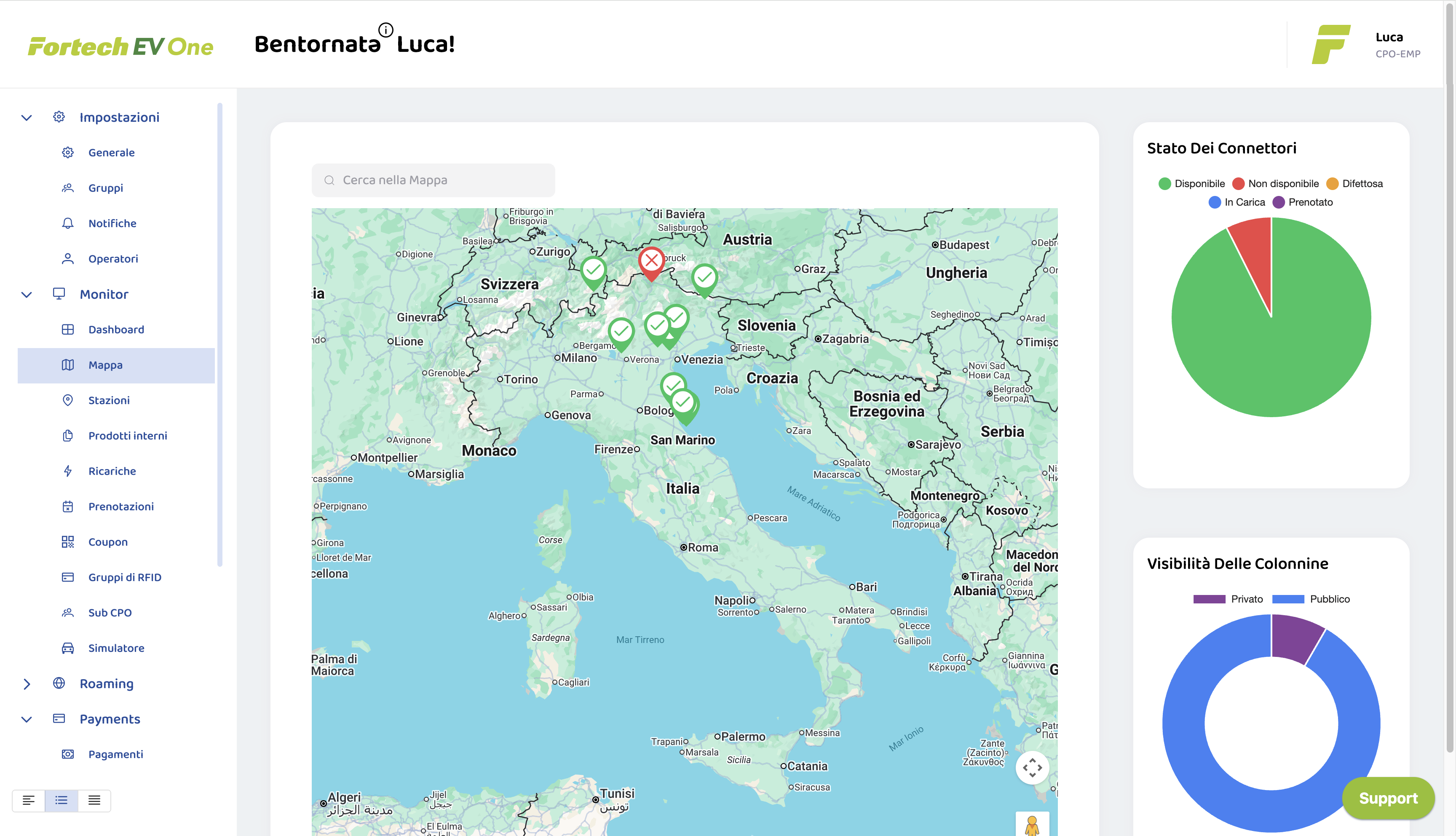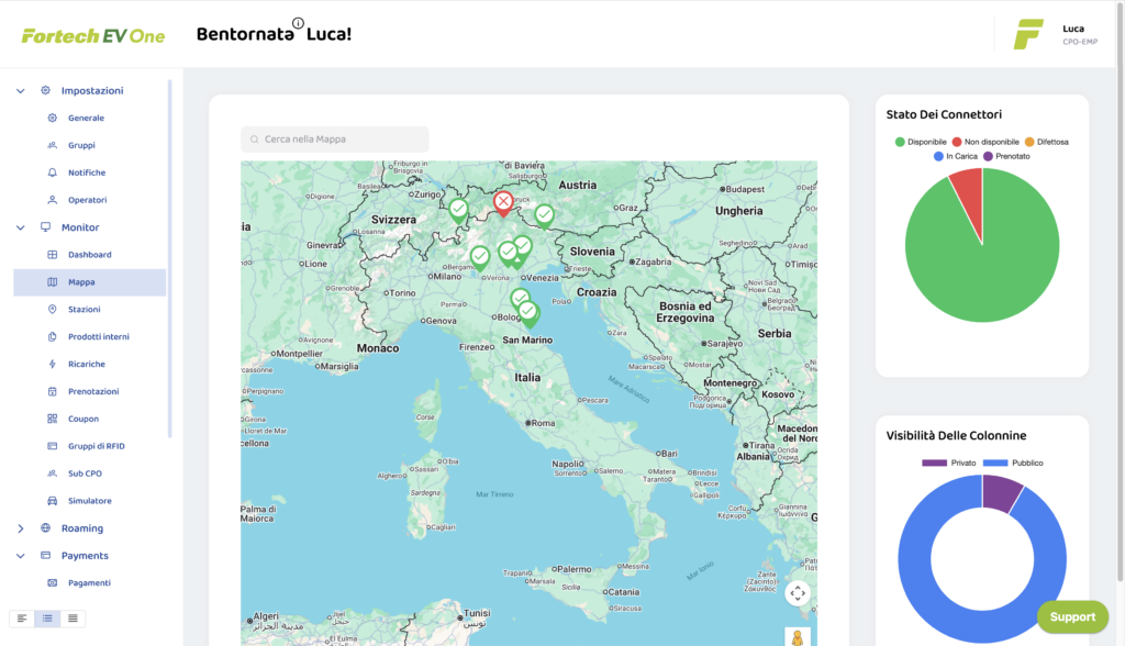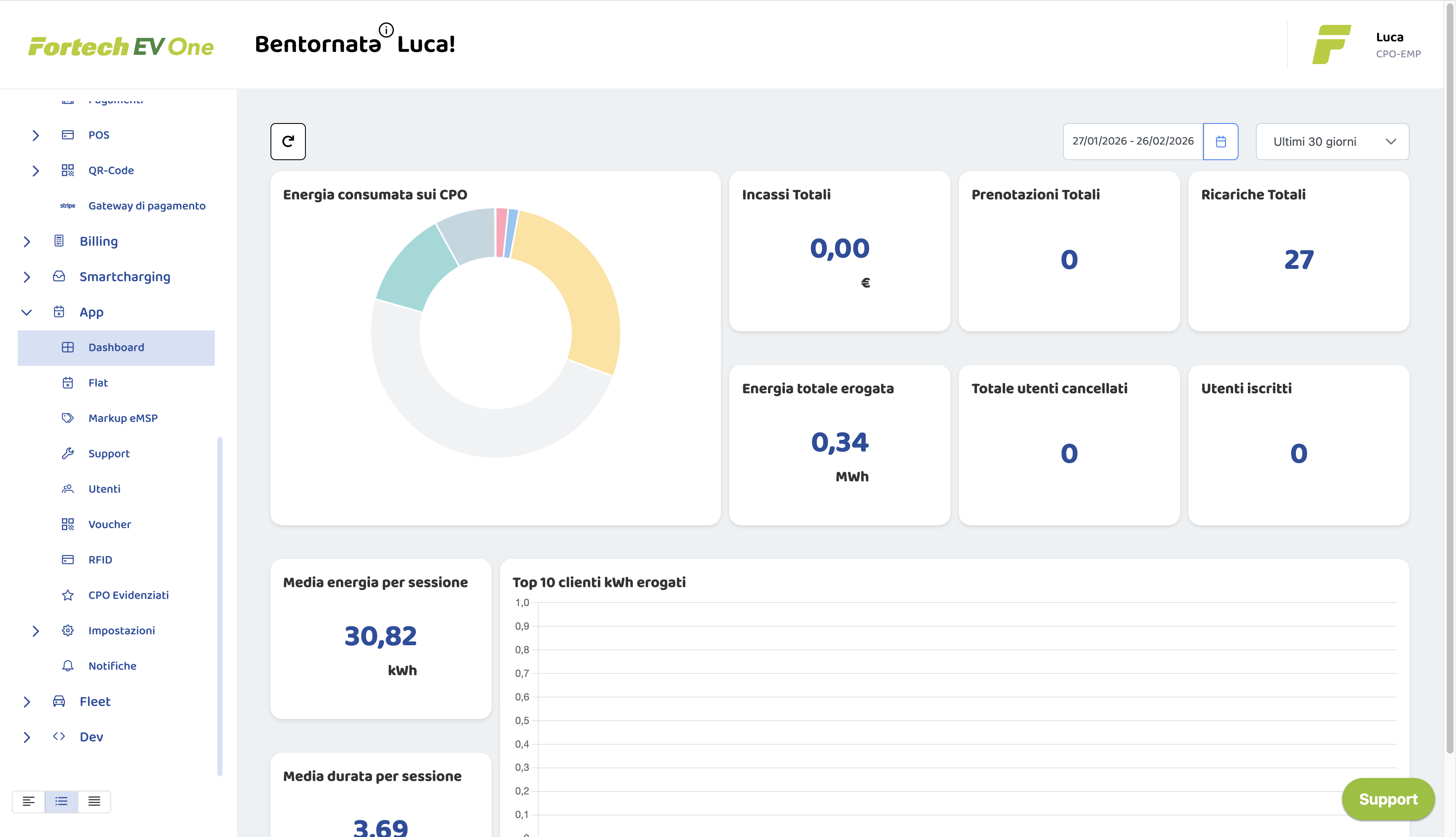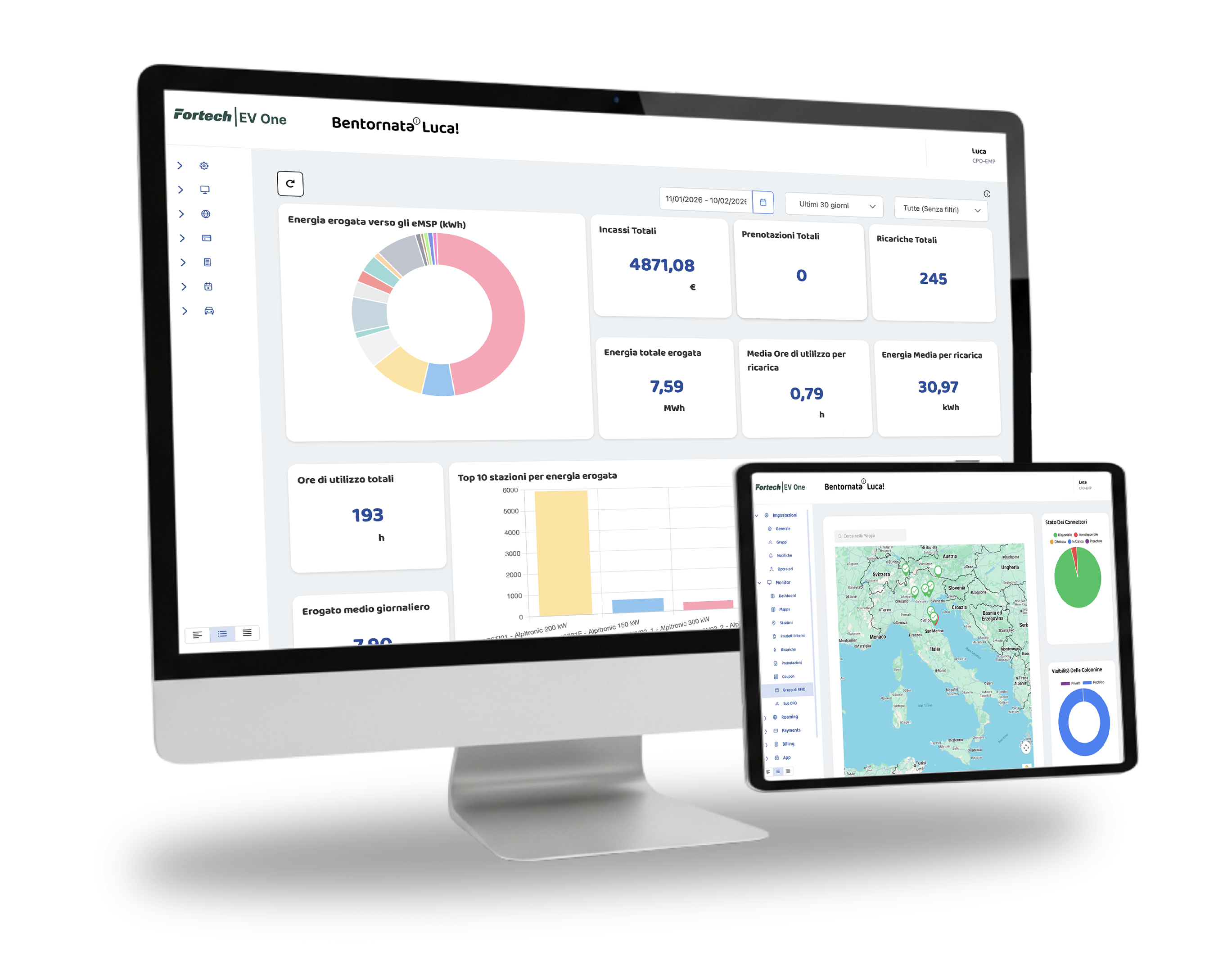 Fortech EV One integra nativamente funzionalità di gestione della rete, di controllo degli stati, dei consumi e dei pagamenti e degli adempimenti normativi come la fatturazione elettronica e i corrispettivi fiscali.